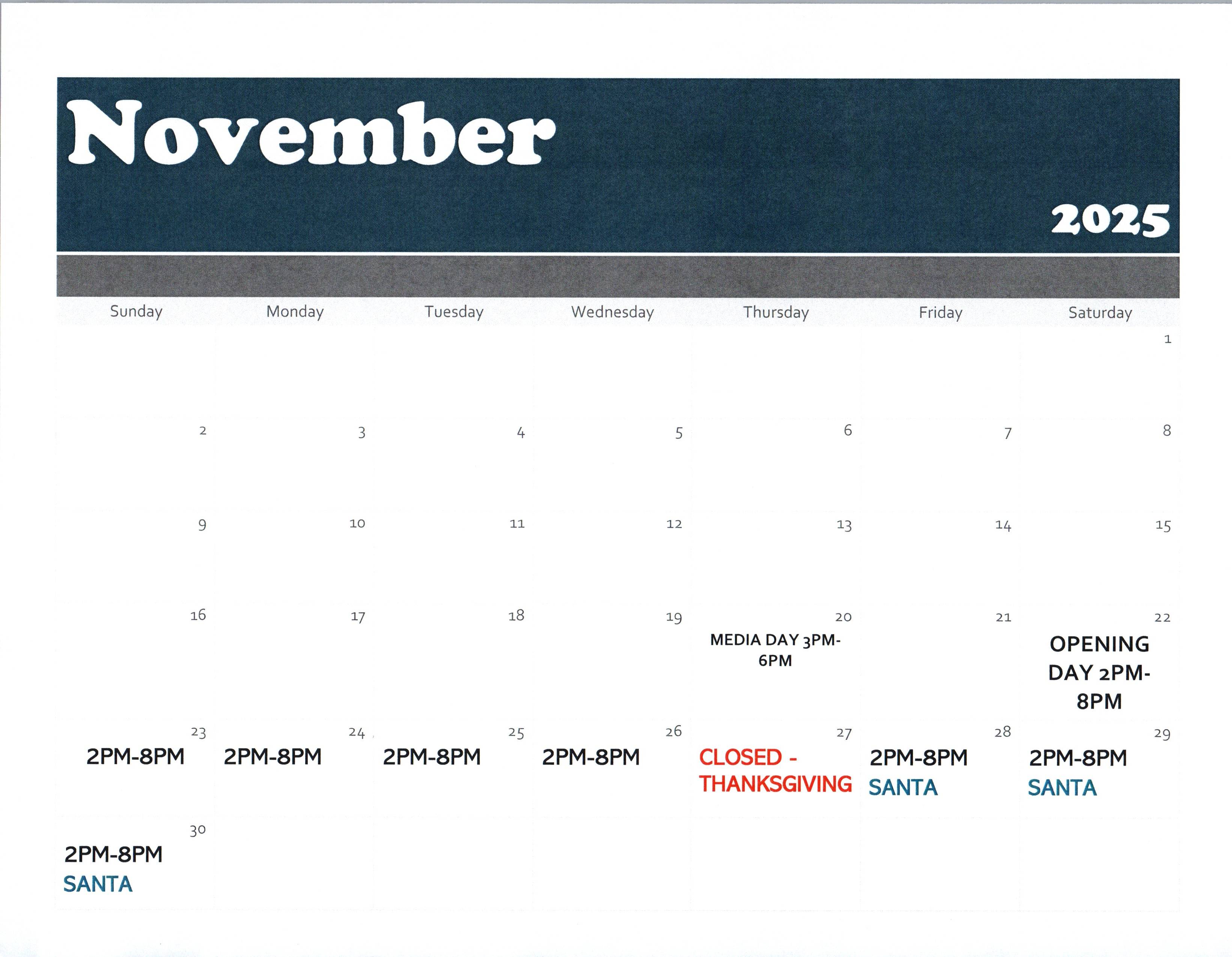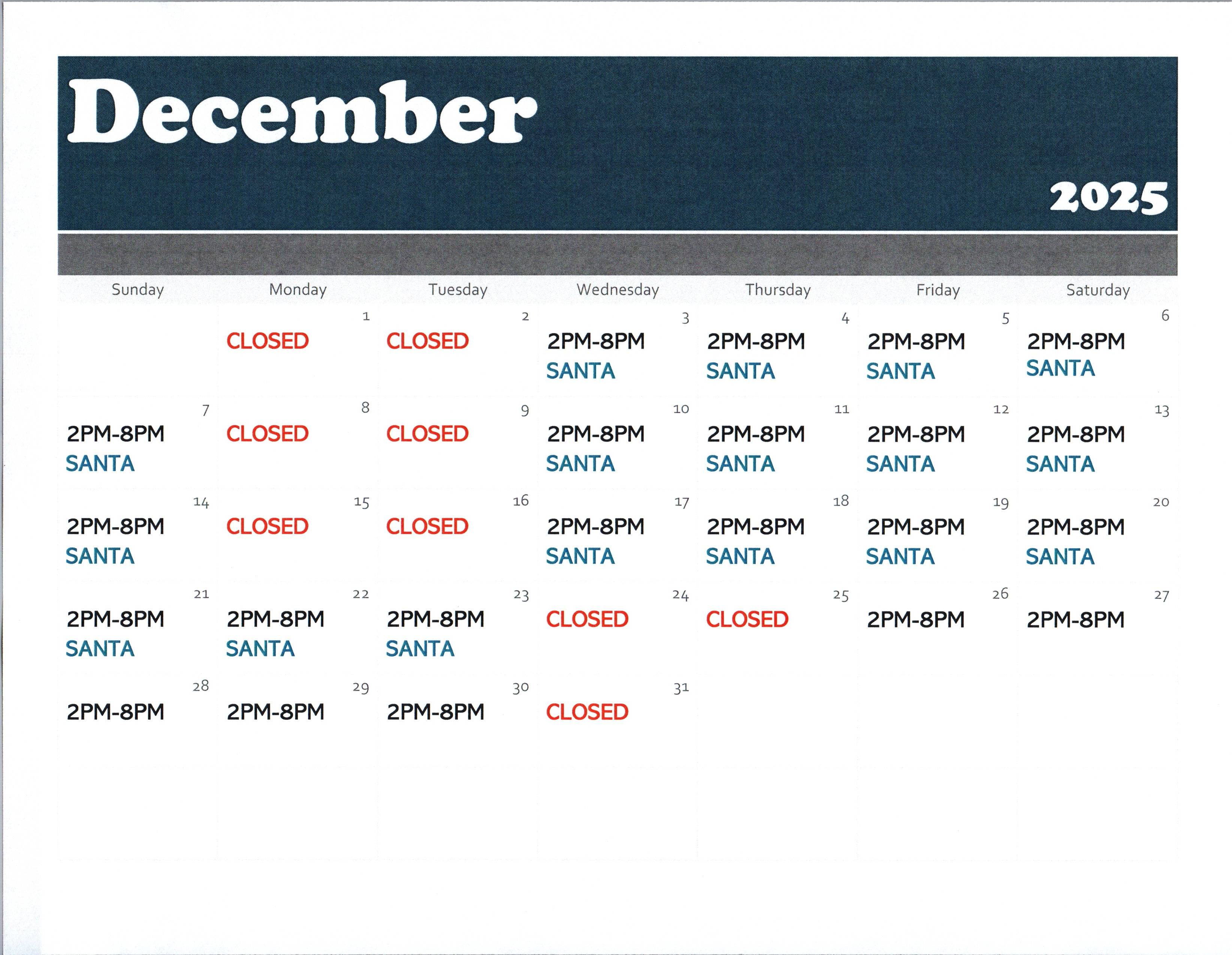 - See the calendar below for the operating schedule and Santa hours