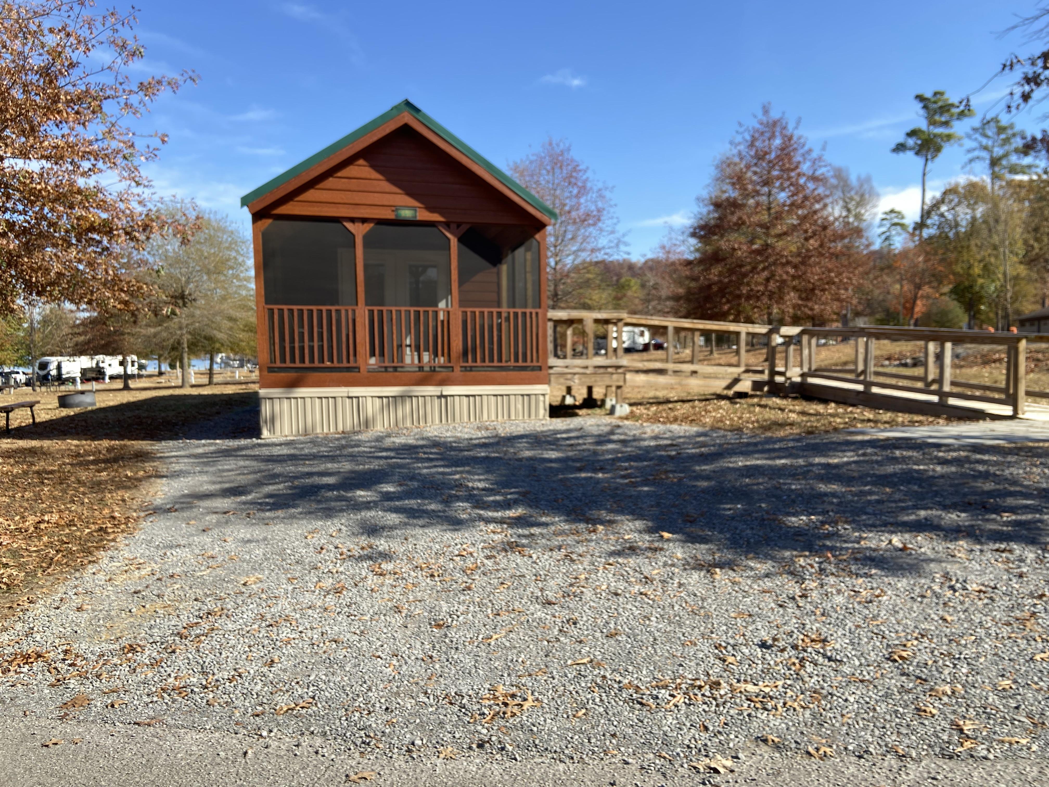 - (1) One cabin is ADA accessible and includes a bedroom with a queen bed and a common area with an eat-in kitchen (E43).