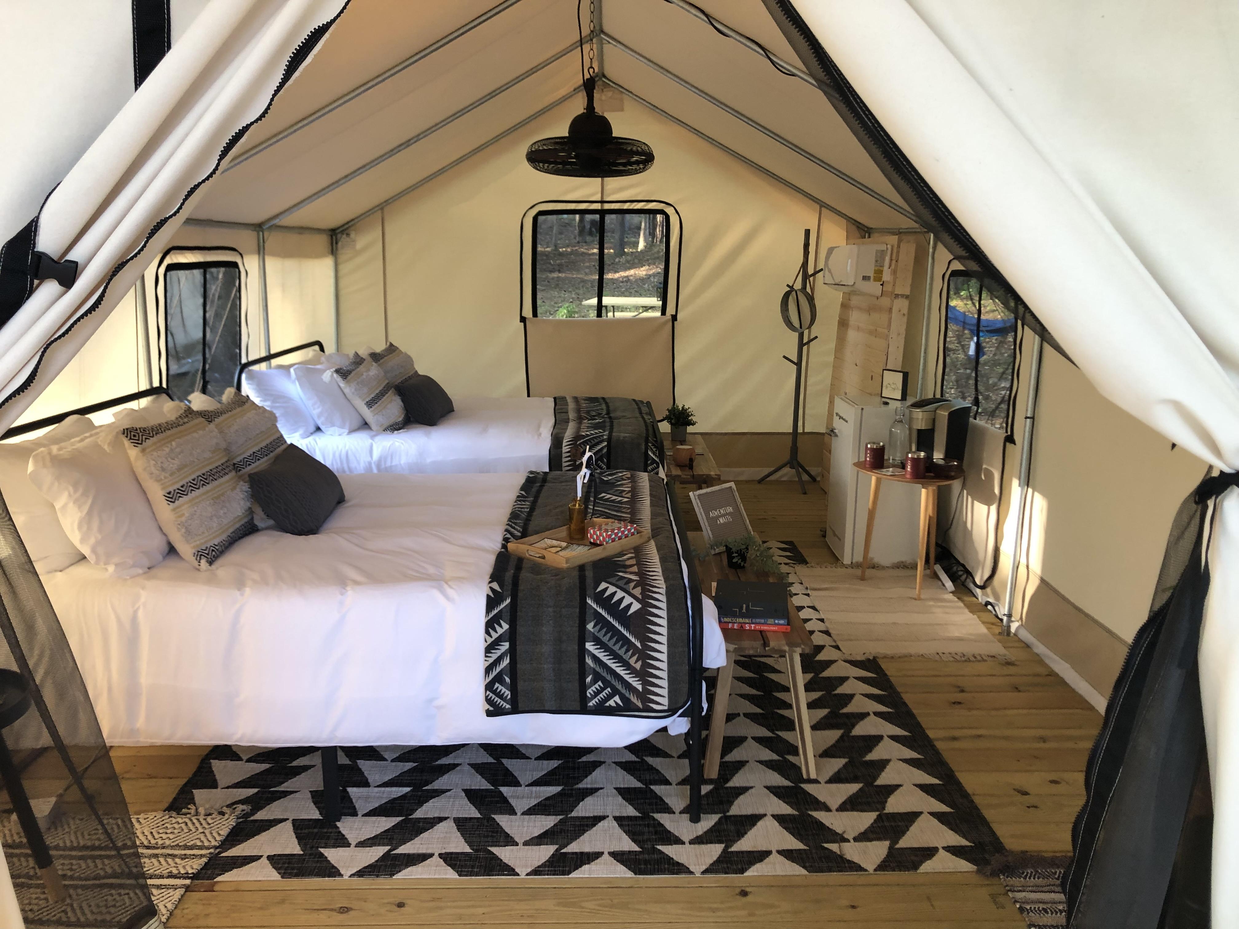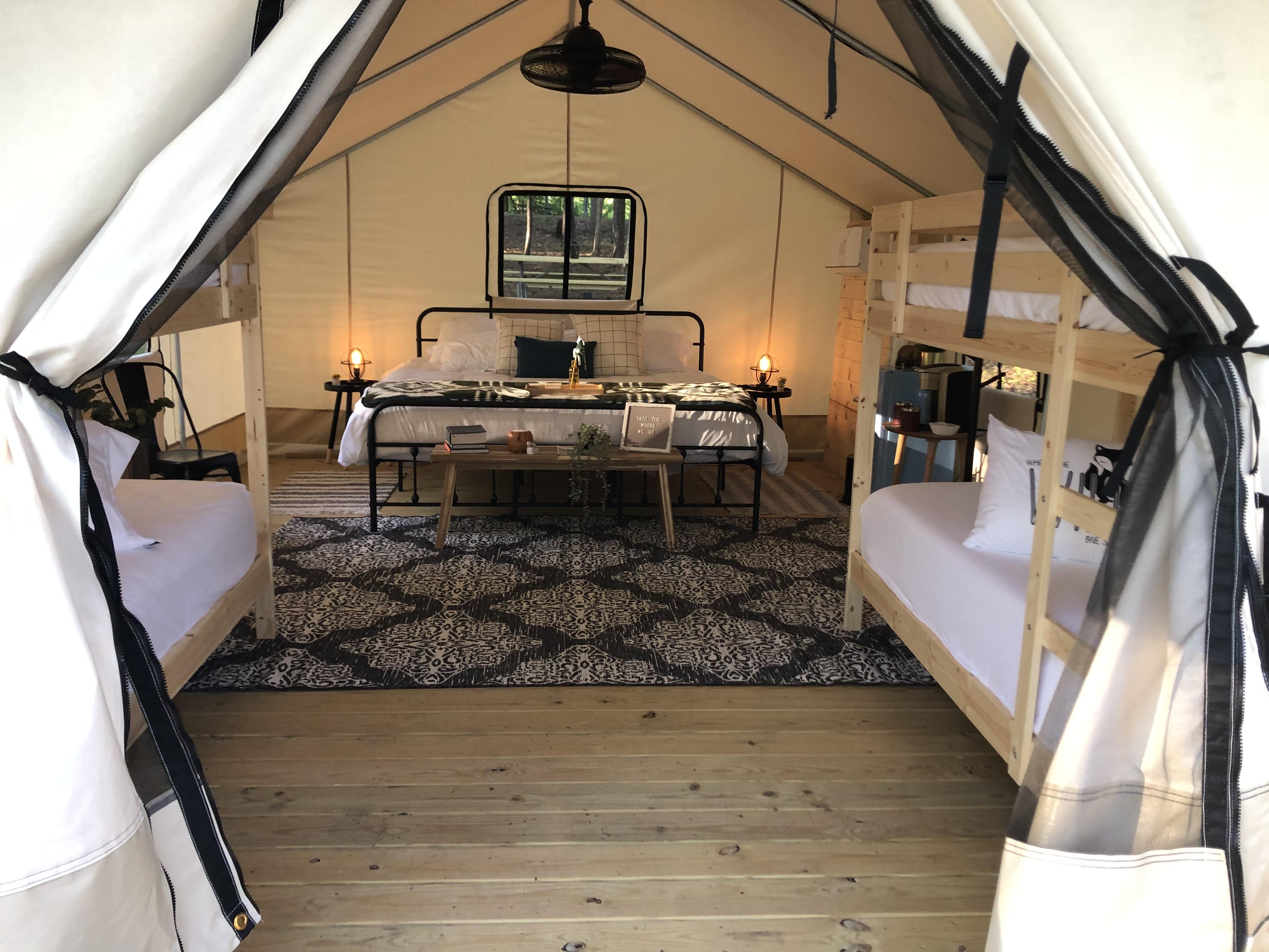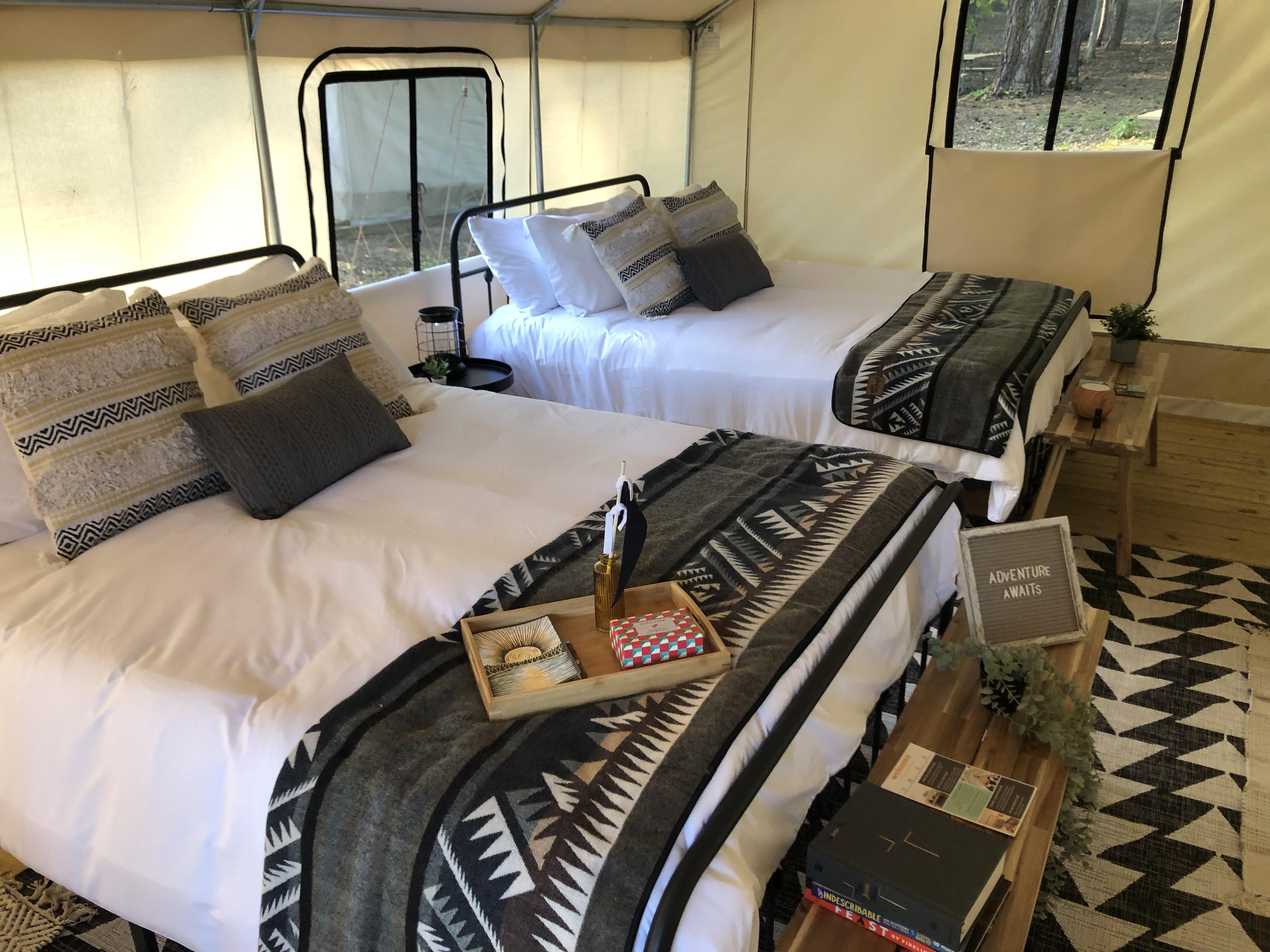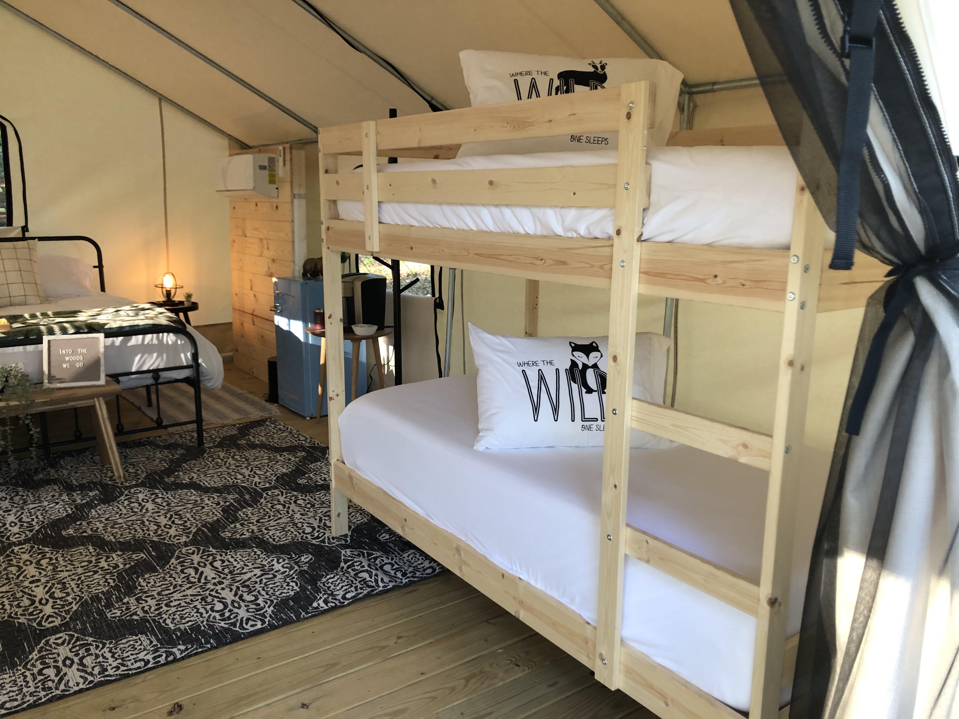 If you are interested in rustic comfort in the great outdoors, look no further than the new Glamping Safari Tent accommodations. Combining luxury and the great outdoors, these extra spacious completely furnished Safari Tents give large families or groups of friends the extra space they need to glamp in comfort.