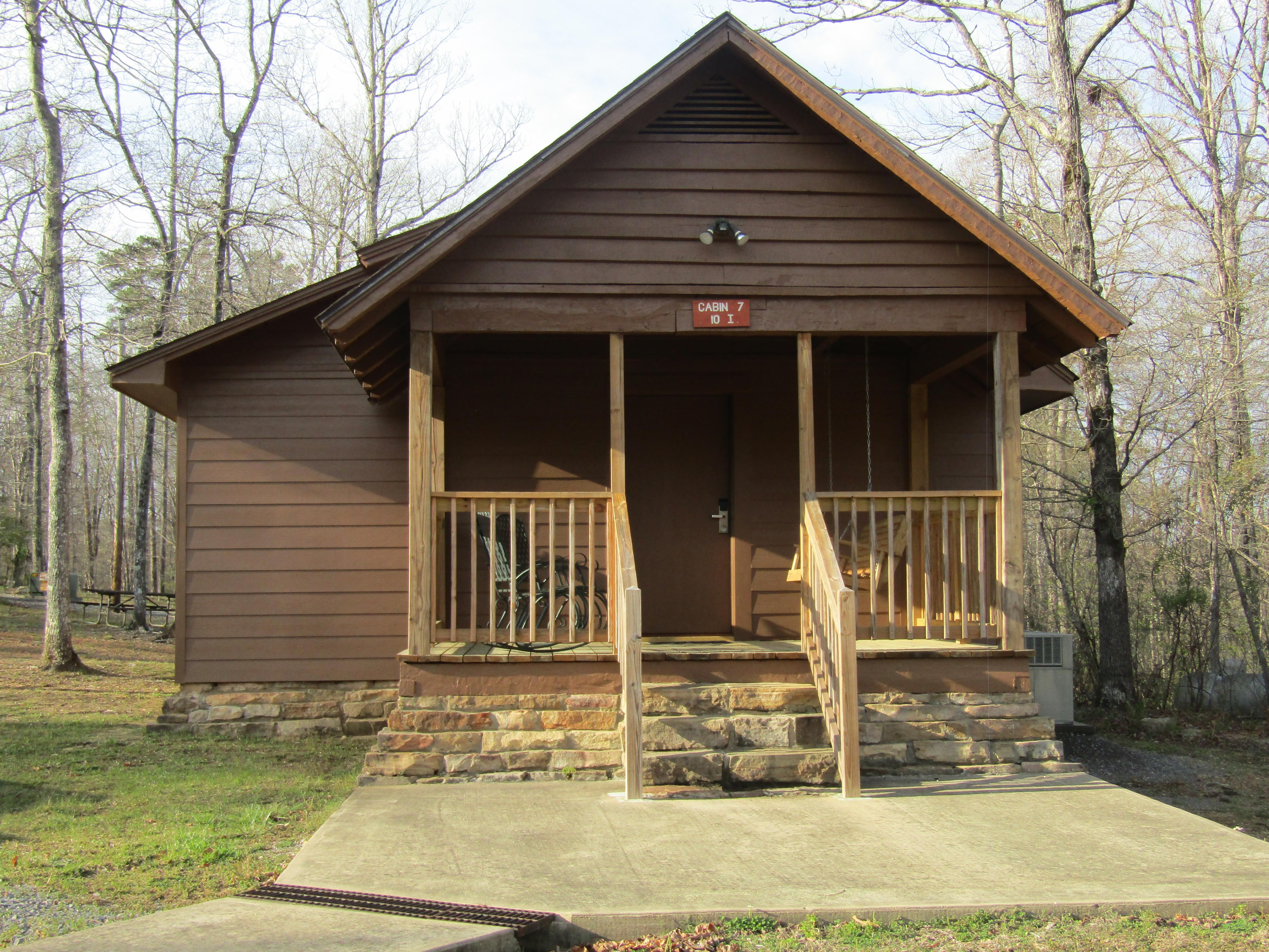Enjoy a peaceful getaway on Lookout Mountain in our fully furnished 1 Bedroom/1 Bath cabin! Cabin 7 accommodates a maximum of two (2) guests with one bedroom with a king size bed, full bathroom, an open living room with cable TV and fireplace, and a fully furnished kitchen. Cabin 7 has a beautiful front and back porch with a porch swing and rocking chairs to relax and reconnect with nature. All linens are supplied. Cabin 7 has a picnic table, charcoal grill, and campfire ring outside. Accommodates 2 adults.
