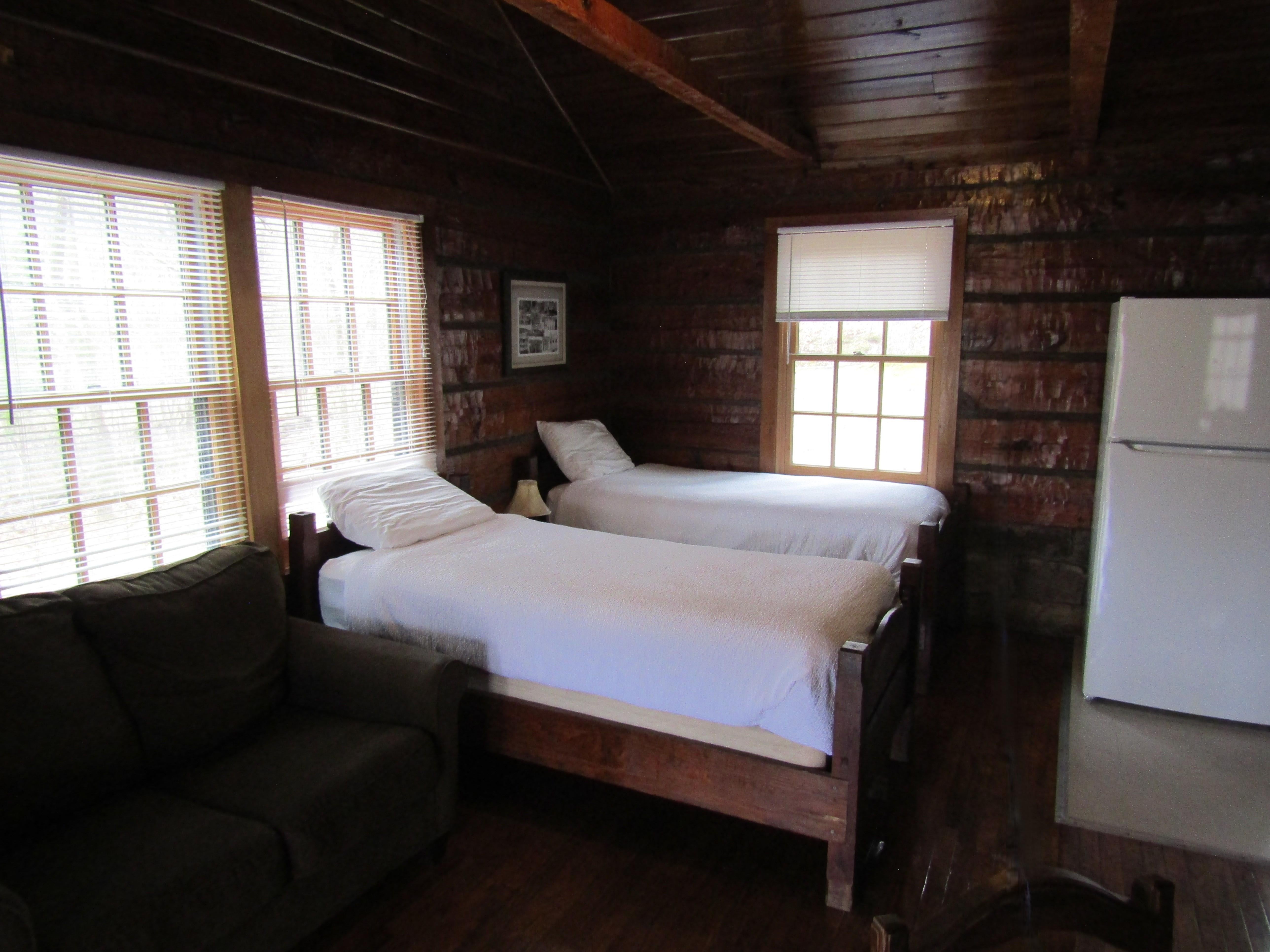 - Cabins 8, 9, and 11 have 1 bedroom with a full-size bed, 2 twin-size beds and a sleeper sofa (twin-size) in the living area, and one full bath. (Accommodates up to 4 adults. Cabin 11 is dog friendly)