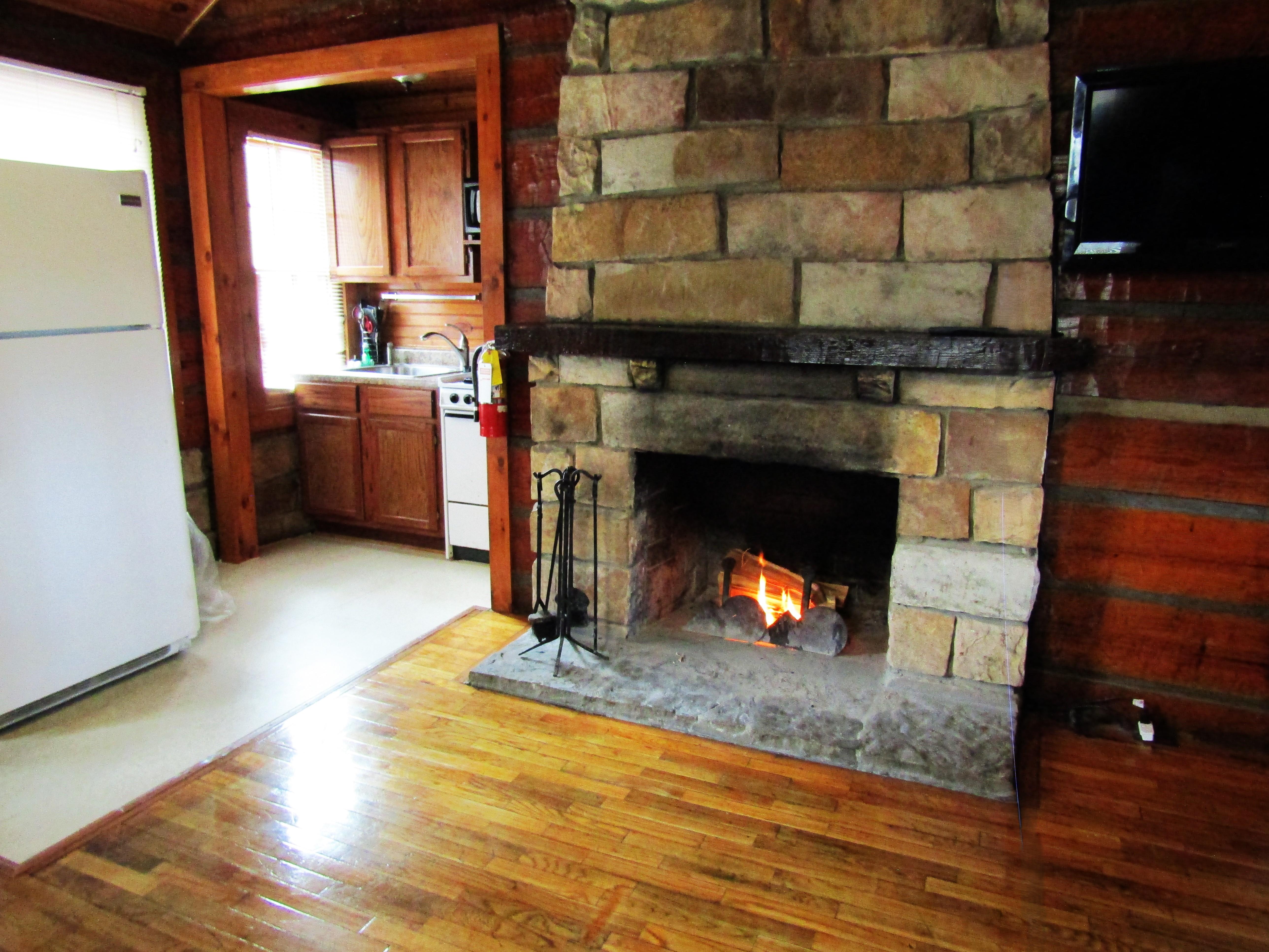 Our Rustic Cabins are perfect for a romantic getaway or a family retreat. Rustic Cabins have an open Living Room/Kitchen concept. The living room includes a beautiful Fireplace and Cable TV. The Kitchen is equipped with utensils and basic cookware. Each Rustic Cabin has central heating and air conditioning. Includes a covered porch with rocking chairs perfect for unwinding and enjoying nature. Outdoor charcoal grill, picnic table, and campfire ring. All linens are supplied.