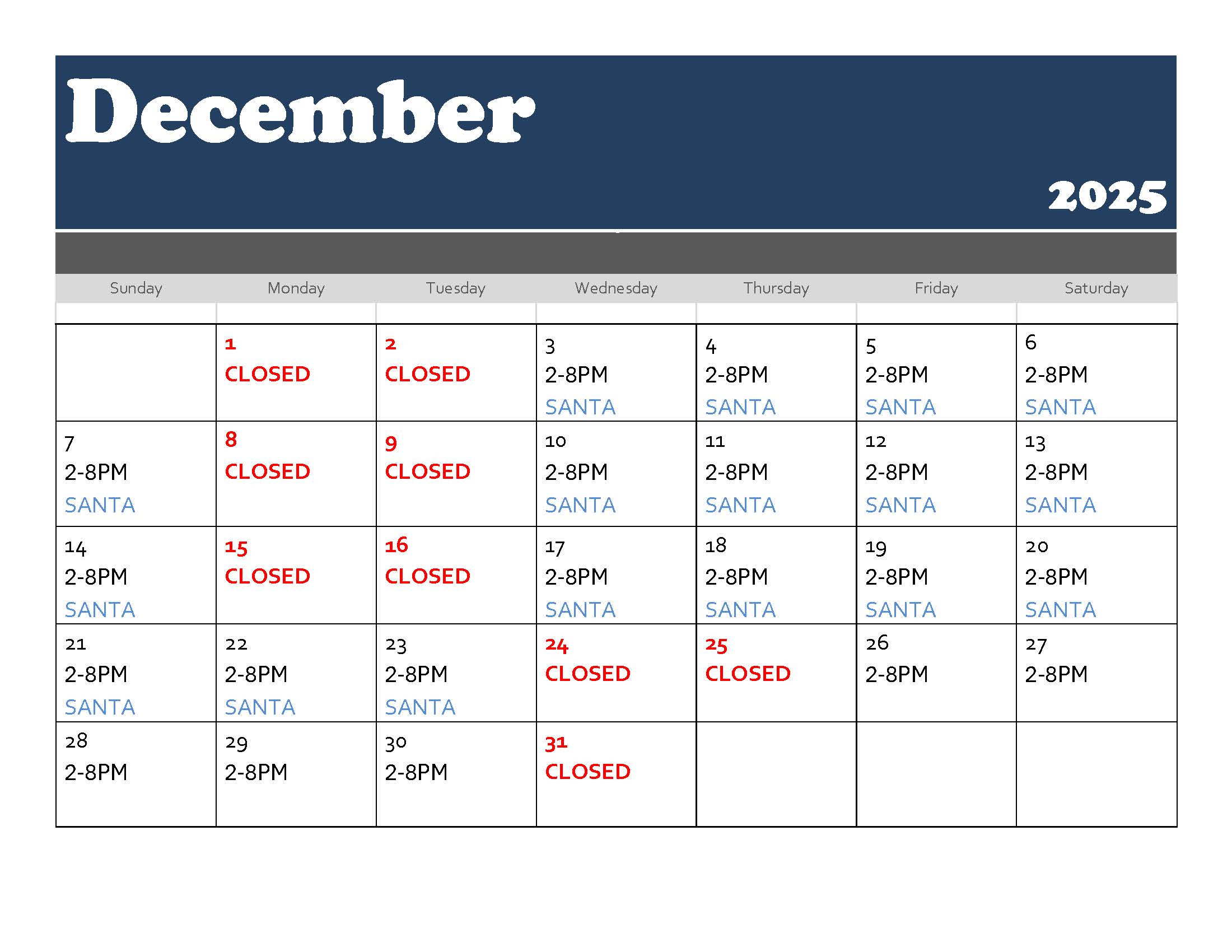 For school groups of 100 or more, limited reservations are available on Wonderland Under Warrior regular operating days. Reservations can be made during operating hours, or if made at least two weeks in advance, groups of 100 or more can be reserved for 12:30 P.M., with the option to see Santa from 1:00 P.M. to 1:30 P.M.